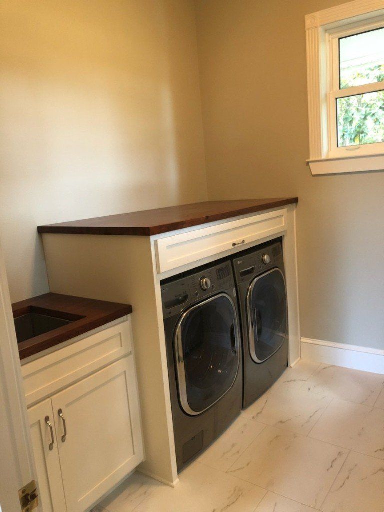 Here you will see a new custom laundry room / pantry addition which is located right off the existing main kitchen. We raised the slab of the existing front porch and enclosed the new heated and cooled area. We installed new custom cabinets with cherry butcher block tops and marble floors. Just beautiful !!!